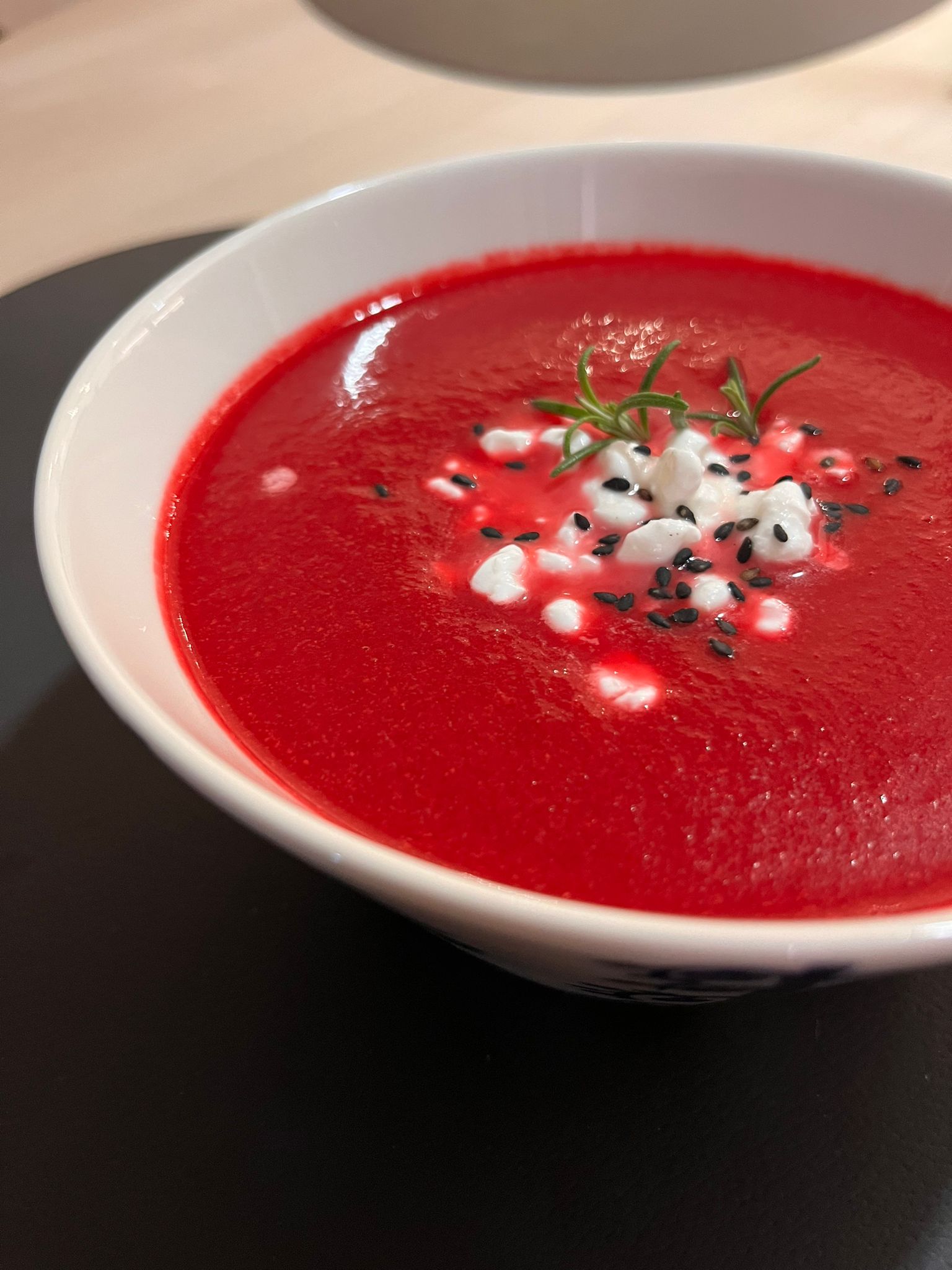 Tein keittoa kerralla kaksi annosta: n. 500g punajuuria ja 250g raejuustoa. Keitin punajuuret suolavedessä johon lisäsin sipulia, valkosipulia ja rosmariinia. 40 min punajuuria keitettyäni nostin kattilan pois liedeltä ja soseutin punajuuret, lisäten samalla sekaan raejuuston.
