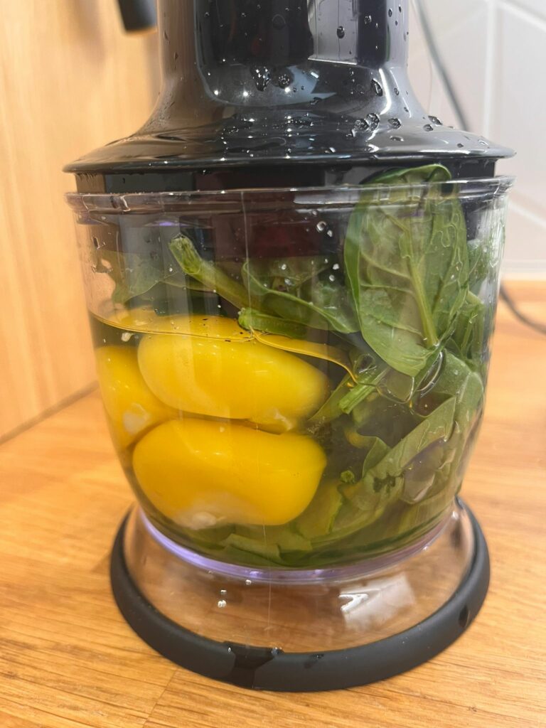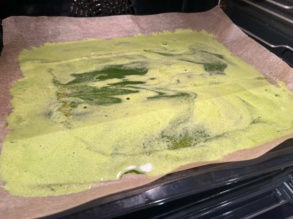 - Lisää ainekset tehosekoittimeen ja sekoita kunnes lopputulos on hyvin vihreää ja juoksevaa. Levitä pellille pyöreäksi, ohueksi levyksi. Pidä uunissa 175 asteessa n. 15 minuutin ajan.