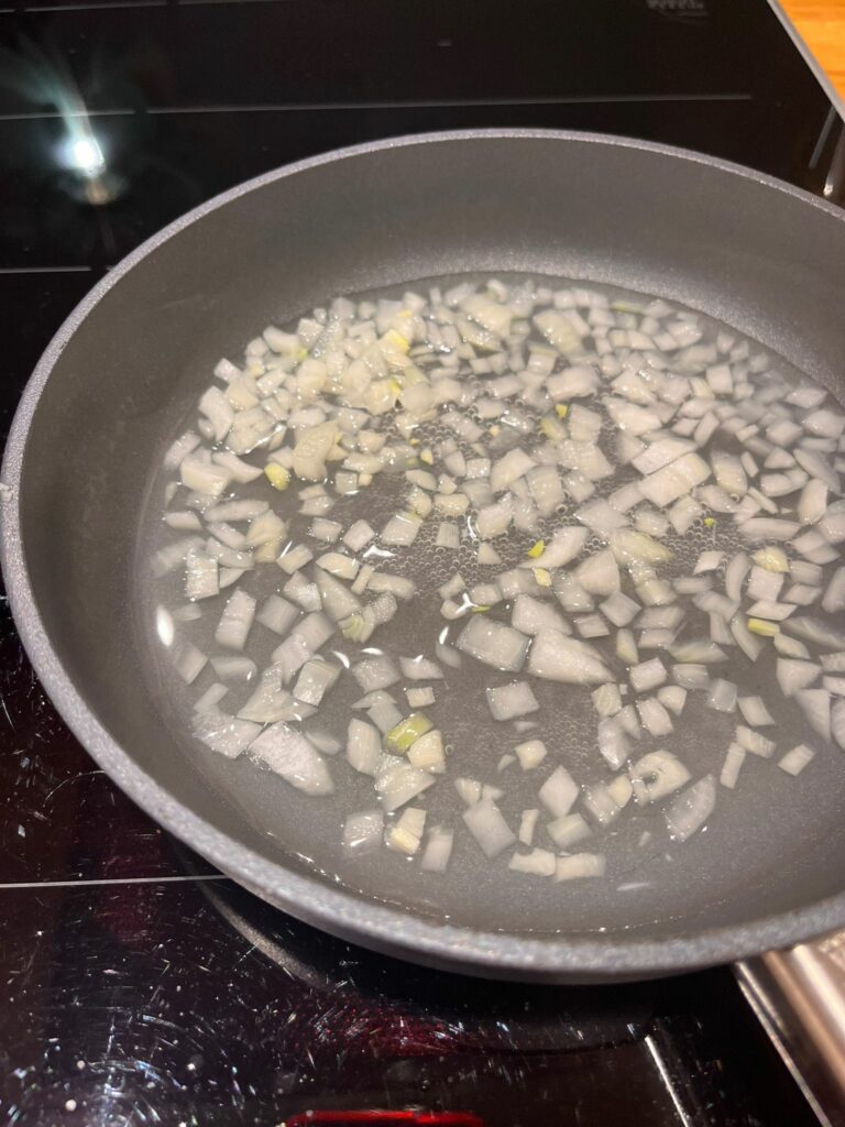 1. Kypsennä halutessasi pieneksi pilkotut sipuli ja valkosipuli pannulla pienessä määrässä vettä