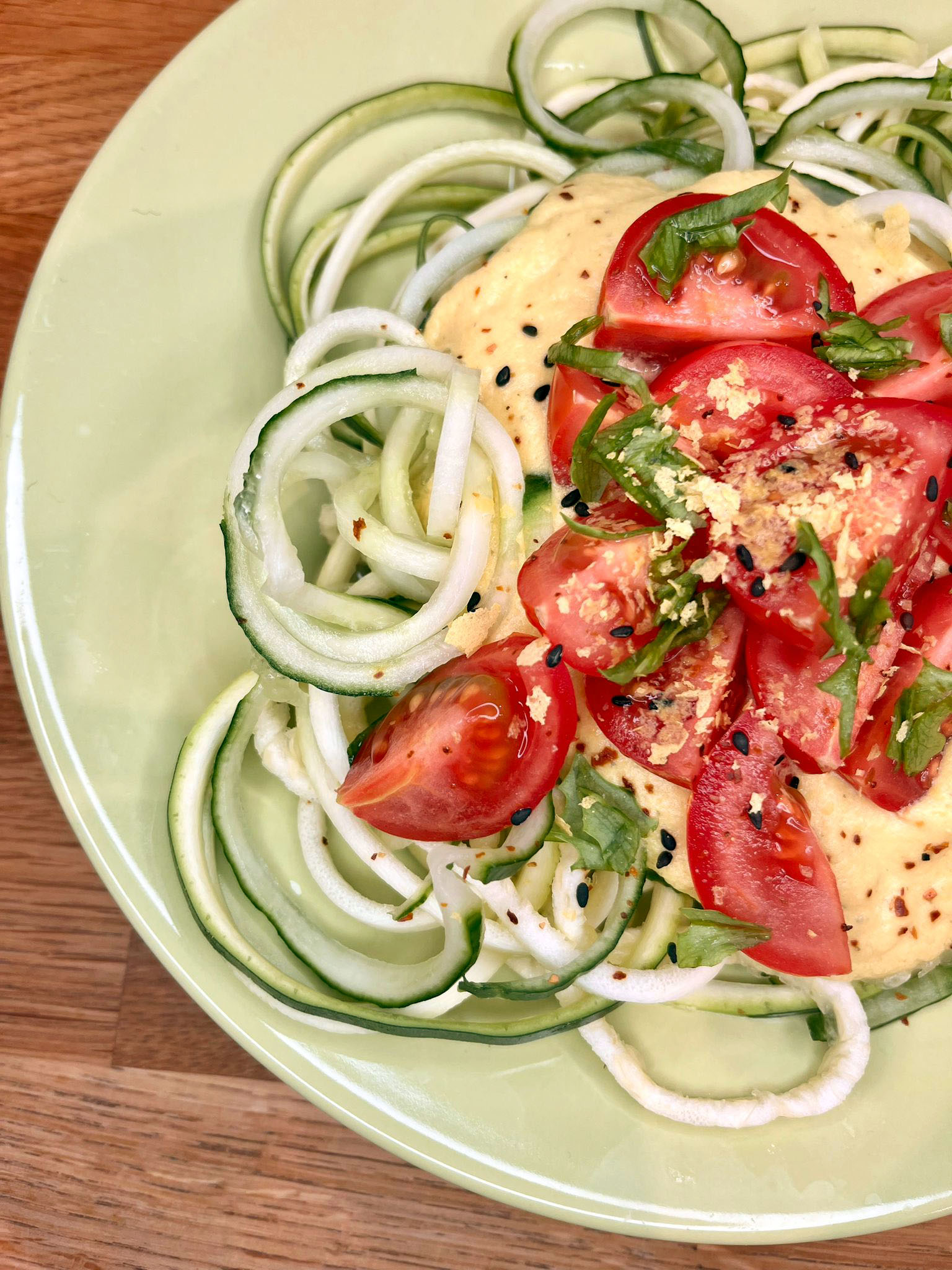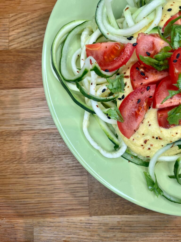 Tätä ruokaa suunnitellessani lähdin liikkeelle todella helposta pikaruoasta: ainoa tarvittava kypsennysmetodi on mikroaaltouuni ja senkin voi halutessaan jättää välistä. Silken-tofu ja kikherneet luovat proteiinipitoisen kastikkeen joka saa mukavasti rakennetta spiraloidusta kesäkurpitsa- ja kurkkupastasta.